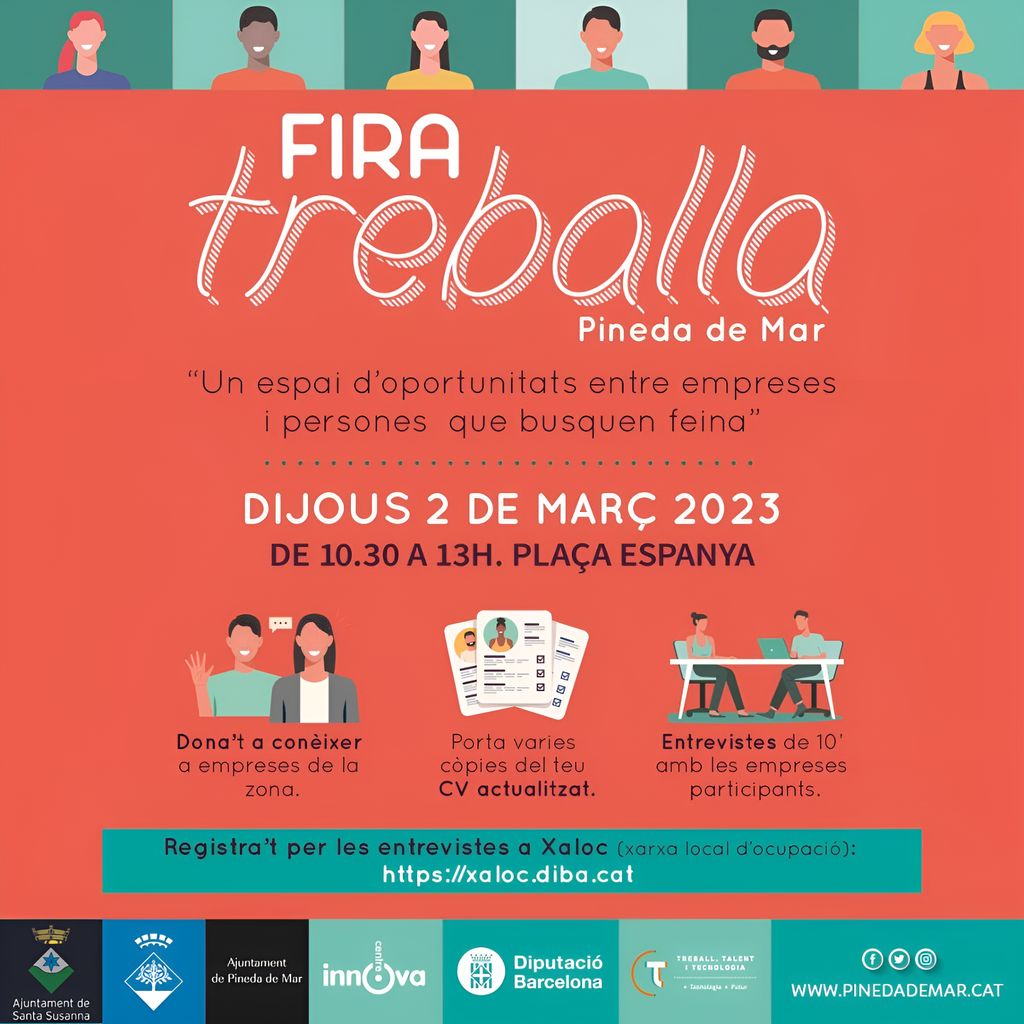 El Servei Local d’Ocupació de l’Ajuntament de Santa Susanna, juntament amb el Centre Innova de l’Ajuntament de Pineda de Mar i dins del Programa Treball, Talent i Tecnologia de la Diputació de Barcelona, organitza la primera edició de la FIRA DEL TREBALL, el dijous 2 de març de 10:30 a 13 h, pels usuaris del Servei d’Ocupació.