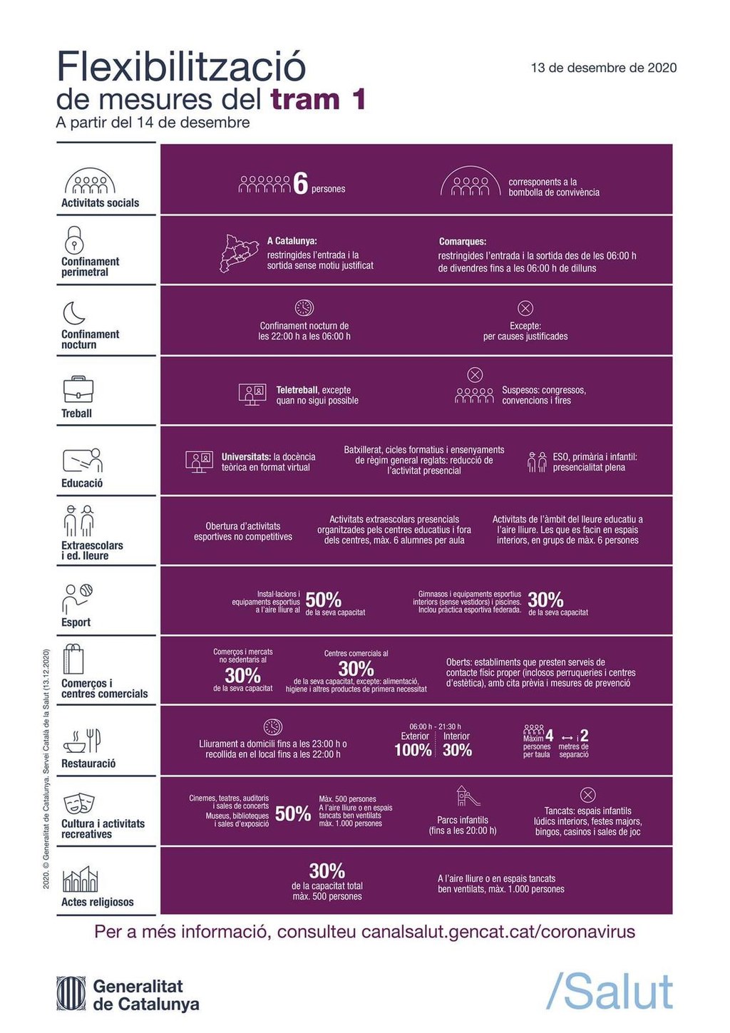 S'han actualitzat les mesures de seguretat sanitària pel tram 1. Aquesta flexibilització és aplicable des de dilluns 14 de desembre; per a més informació consulteu http://canalsalut.gencat.cat/coronavirus