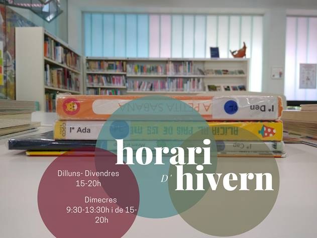 Les biblioteques públiques com a equipaments culturals han estat sotmeses a la revisió de les mesures especials aplicades en el darrer pla de contenció de Covid-19 s’havien acordat. Això vol dir que estan reoberts tots els serveis i totes les activitats que es faran de manera presencial, amb la nova limitació d’aforament del 50%. En el cas de les activitats les que estan programades són grups estables ja formats i s’oferirà la possibilitat de seguir-les virtualment si hi ha persones de risc que així ens ho demanin. Els horaris actuals són: Tardes: de dilluns a divendres, de 15 a 20h. Matins: dimecres, de 9.30 a 13.30h. Recordeu que es permet l’accés lliure a tota la biblioteca, sense més restriccions que la limitació d’aforament al 50% de la nostra capacitat. Es pot venir a estudiar, a fer ús dels ordinadors, a consultar diaris i revistes, etc.