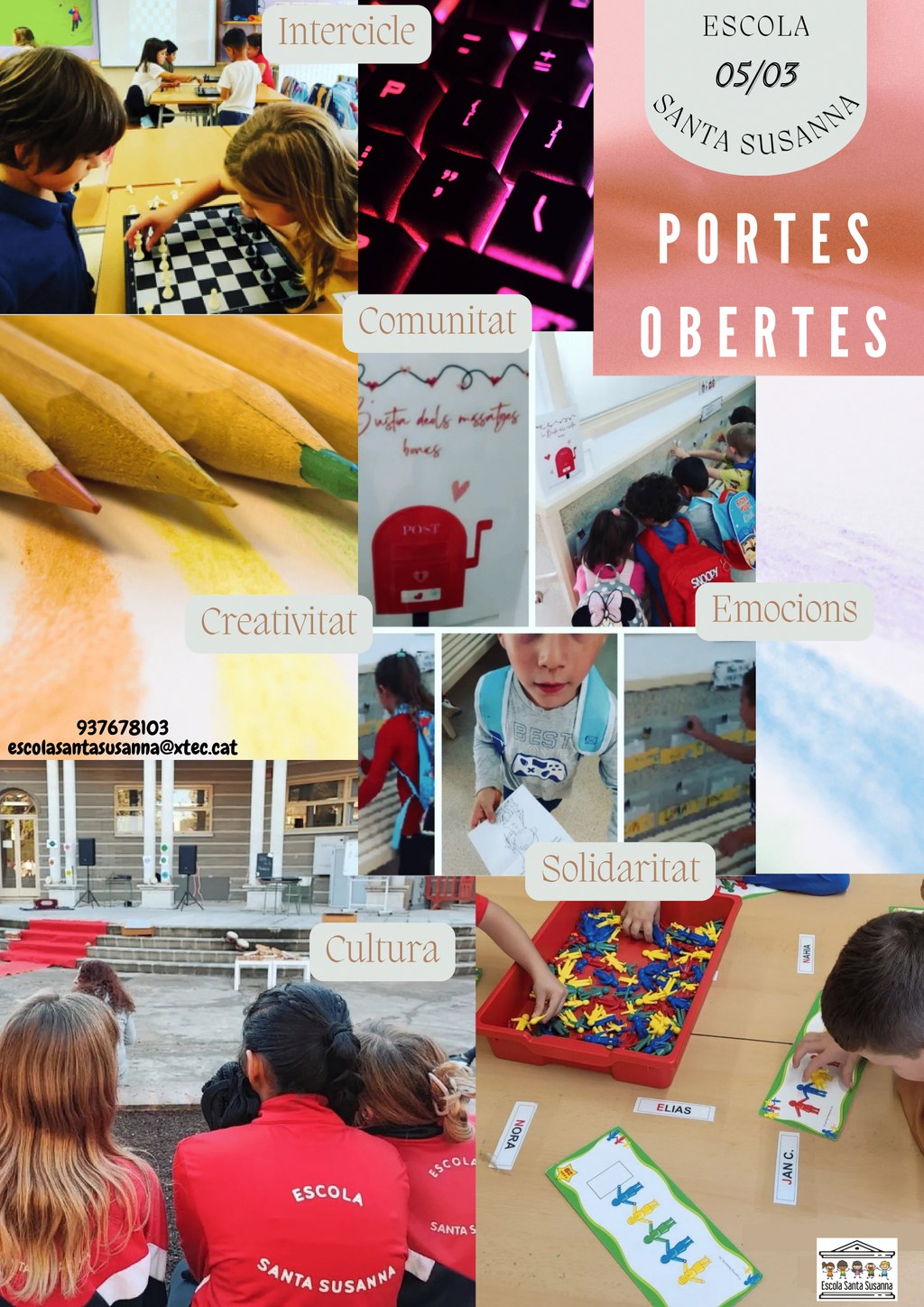 El pròxim diumenge 5 de març i d'11 del matí a 1 del migdia, l'Escola Santa Susanna organitza la Jornada de Portes Obertes perquè tots aquells que vulguin inscriure-hi la seva mainada puguin veure les instal·lacions. Per a més informació podeu consultar la imatge adjuntada, trucar al 937678103 o enviar un correu electrònic a escolasantasusanna@xtec.cat.