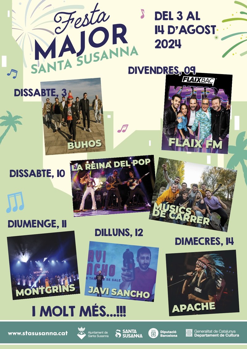 Del 3 al 14 d'agost, gaudeix de concerts, activitats, gegants, correfoc i molt més. Una programació per a tothom que no et pots perdre! #FestaMajorSantaSusanna