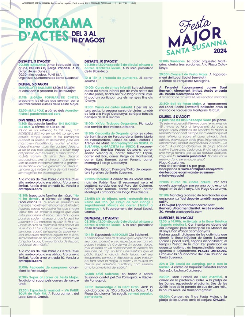 La Festa Major de Santa Susanna arriba carregada d'emocions!Del 3 al 14 d'agost, gaudeix de concerts, activitats, gegants, correfoc i molt més. Una programació per a tothom que no et pots perdre! #FestaMajorSantaSusannahttps://www.stasusanna.cat/ca/actualitat/noticies/la-festa-major-de-santa-susanna-arriba-carregada-democionshttps://www.stasusanna.cat/ca/actualitat/noticies/la-festa-major-de-santa-susanna-arriba-carregada-democions/@@images/image-1200-f486a1ee7998200afd9e9918cbc4b685.jpeg