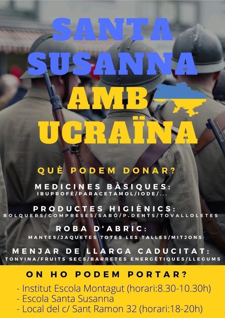 L'Ajuntament recolza plenament la iniciativa d'un grup de veïns i veïnes de Santa Susanna de tirar endavant una campanya de recollida de medecines bàsiques, productes higiènics, roda d'abric i menjar de llarga caducitat per enviar a la població ucraïnesa en uns moments molt delicats. La invasió d'Ucraïna per part de Rússia i l'ús de material de guerra està provocant molts desplaçaments de la població, ferits, famílies que ho han perdut tot, etc. En aquests moments, els ciutadans ucraïnesos necessiten més que mai l'ajut i l'escalf d'occident. "A Santa Susanna hem de demostrar que som solidaris i que sabem estar amb aquells que pateixen i ens necessiten", ha assegurat l'alcalde Joan Campolier. "El vostre ajut serà sempre benvingut".