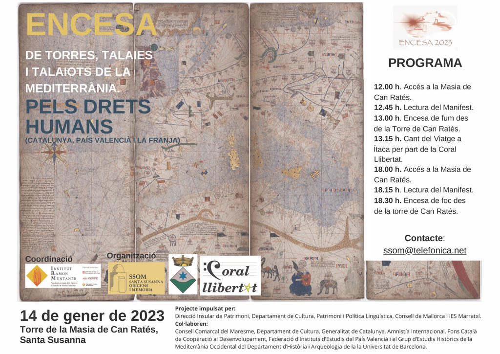 El pròxim dissabte 14 de gener a partir de les 12 del migdia, la Masia de Can Ratés serà el punt geogràfic on es realitzi l'Encesa de torres, talaies i talaiots de la Mediterrània, pels Drets Humans. Un esdeveniment que està organitzat per SSOM juntament amb l'Ajuntament de Santa Susanna i Coral Llibertat; i que està coordinat per l'Institut Ramon Muntaner. Amb això, Santa Susanna forma part de les 26 poblacions de Catalunya, Aragó i València integrants que encendran un total de 32 torres i/o fortificacions amb els objectius de, per una banda, sensibilitzar la població sobre la situació que viu el Mediterrani on moltes persones que es veuen obligades a abandonar casa seva hi perden la vida cada any. I per l’altra, reivindicar i fer valdre les torres, talaies, talaiots i fortificacions com a patrimoni històric i cultural present al conjunt dels territoris de parla catalana.