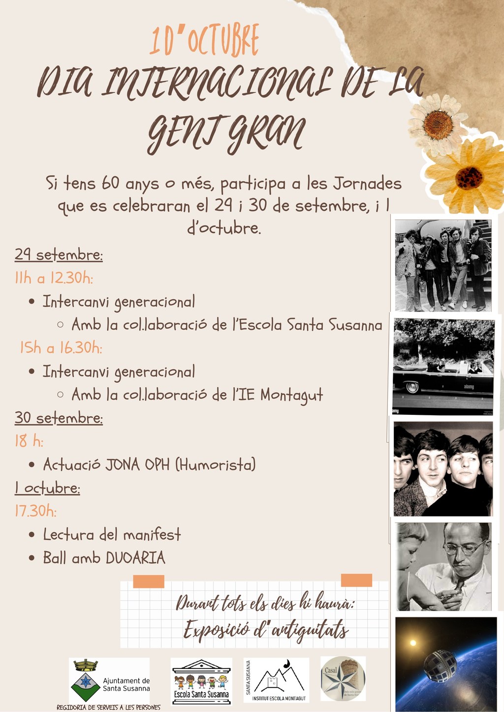 - D'11 h a 12:30 h: Intercanvi generacional amb la col·laboració de l'Escola Santa Susanna.