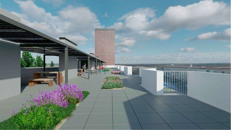 Tant la planta baixa com la coberta tenen espais comunitaris. A la planta baixa hi ha l’aparcament i la coberta té una zona enjardinada. A més, a la coberta hi ha un espai d’estendre la roba col·lectiu i una zona per rentar la roba. Aquesta bugaderia s’organitza a través d'una aplicació perquè cada inquilí pugui reservar quan la vol fer servir. Això representa un estalvi de cost i manteniment importants. La coberta també acull un espai polivalent vinculat a una gran terrassa orientada al sud per a diversos usos: esport, joc pels infants, celebracions, descans, hort urbà, etc..