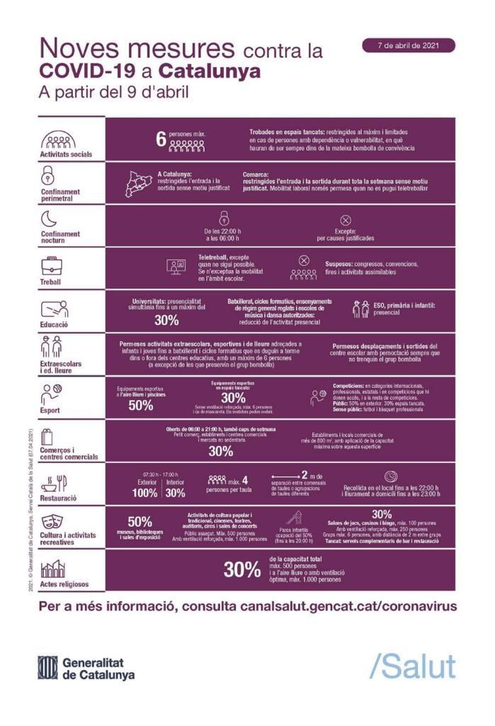 Actualització de les mesures que han adoptat els responsables de la Generalitat de Catalunya contra la Covid-19 A partir d’aquest divendres dia 9 d’abril, entren en vigor la pròrroga i les noves mesures que ha adoptat el Procicat per lluitar contra la Covid-19. Les més destacades són les següents: Limitació de l'entrada i sortida de persones del territori de Catalunya, excepte per a aquells desplaçaments, adequadament justificats. Es torna al confinament comarcal. La mobilitat només es pot fer dins la comarca, amb les excepcions justificades. Mesures de restricció de la mobilitat nocturna. Estan prohibits tots els desplaçaments i la circulació per les vies públiques entre les 22.00 hores i les 06.00 hores. Horaris de tancament de les activitats permeses és el corresponent a cada activitat, sense que en cap cas pugui superar les següents franges: entre les 06.00 hores i les 21.00 hores, en general; entre les 06.00 hores i les 22.00 hores, en cas d'activitats culturals i per a la recollida a l'establiment en els serveis de restauració, entre les 06.00 hores i les 23.00 hores per a l'activitat de prestació de serveis de restauració a domicili. [Llegiu-ne més a continuació]