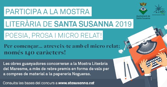 Ja està obert el termini per presentar obres al concurs literari de prosa i poesia de Santa Susanna 2019. Els interessats poden fer arribar els seus textos a l’Ajuntament de Santa Susanna fins al 25 de juny.
