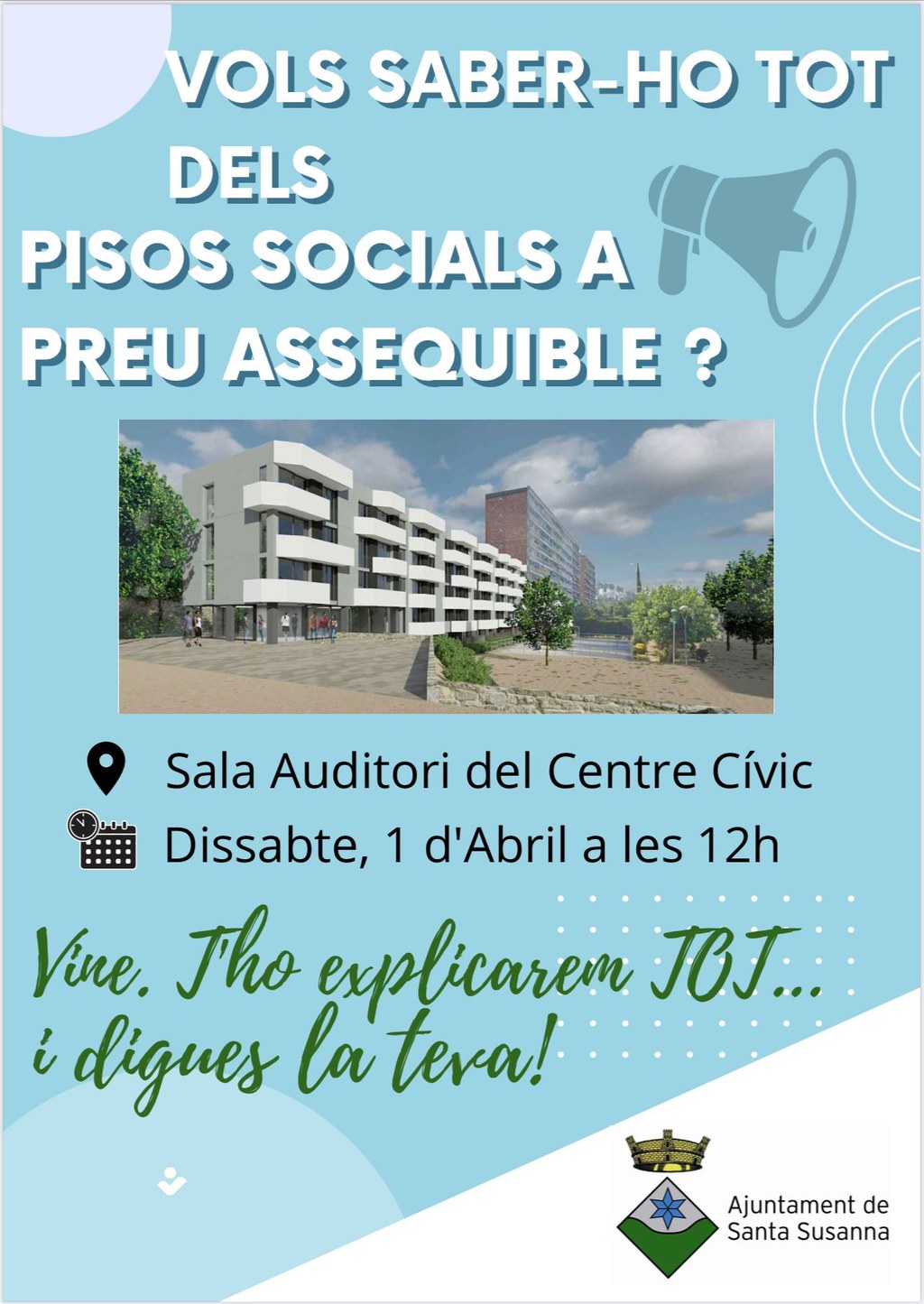 El projecte de construcció de pisos a preus assequibles que es va anunciar fa uns mesos al poble ja és gairebé una realitat. Per aquest motiu, des de l'Ajuntament s'ha convocat una presentació per explicar en detall el "què" i el "com" d'aquesta iniciativa i escoltar les propostes dels veïns interessats en aquesta proposta. La presentació tindrà lloc el pròxim dissabte 1 d'abril a les 12 hores del migdia, a la Sala Auditori del Centre Cívic del poble on s'explicaran tots els detalls del projecte i respondran a les preguntes dels assistents.