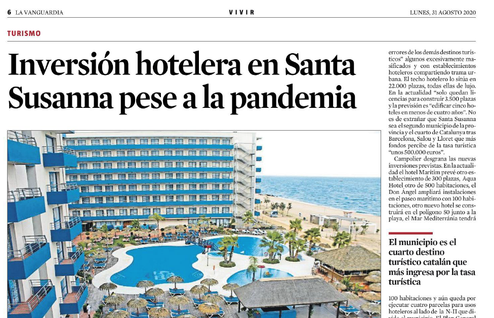 El diari La Vanguardia destaca la inversió hotelera i la reconversió com a destinació de luxe de Santa Susanna. Malgrat la pandèmia, segueix la previsió d’ampliació de places hoteleres, amb la construcció de cinc hotels en menys de quatre anys. L’alcalde, Joan Campolier, afirma que la complicitat amb els hotelers és clau per consolidar la destinació turística. Enguany, malgrat la situació actual, alguns establiments han arribat al 100% d’ocupació durant diversos caps de setmana.