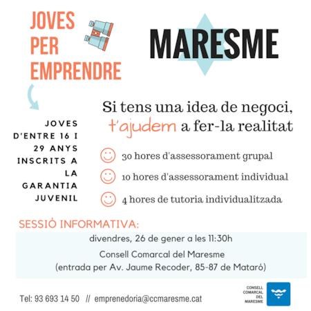 El Consell Comarcal del Maresme durà a terme una sessió informativa de la convocatòria 2018 de Joves per emprendre, un programa que té per objectiu ajudar a joves d’entre 16 i 29 anys inscrits a la garantia juvenil a fer realitat les seves idees de negoci. Aquest programa consta de 30 hores d’assessorament grupal, 10 hores d’assessorament individual i 4 hores de tutoria individualitzada.