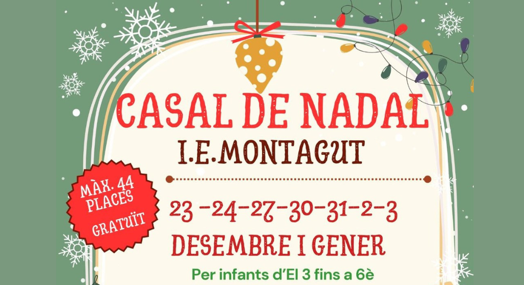 S'obren les inscripcions per al Casal de Nadal, gratuït de l'IES MontagutAquestes vacances de Nadal, del 23 de desembre al 3 de gener, els petits de la casa d'EI3 a 6è de primària poden gaudir d'un munt d'activitats a l'IES Montagut. Prepareu-vos per dies plens de jocs i aprenentatges! Afanyeu-vos, les places són limitadeshttps://www.stasusanna.cat/ca/actualitat/noticies/sobren-les-inscripcions-per-al-casal-de-nadal-gratut-de-lies-montaguthttps://www.stasusanna.cat/ca/actualitat/noticies/sobren-les-inscripcions-per-al-casal-de-nadal-gratut-de-lies-montagut/@@images/image-1200-5930bd6bab08d0ec4d5025afebd63208.png