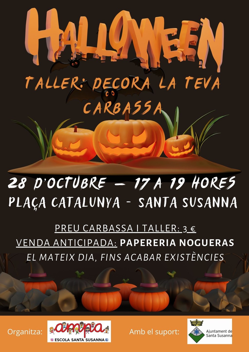 Amb motiu del dia de Halloween, l'ampa de l'Escola Santa Susanna ha organitzat el taller "Decora la teva carbassa" que tindrà lloc el pròxim 28 d'octubre de 17 h a 19 h a la plaça Catalunya. Cada participació té un preu de 3 euros i inclou la carbassa. Els tiquets es poden adquirir de manera anticipada a la papereria Nogueras. Tanmateix, també es podran obtenir el mateix dia fins a acabar existències.