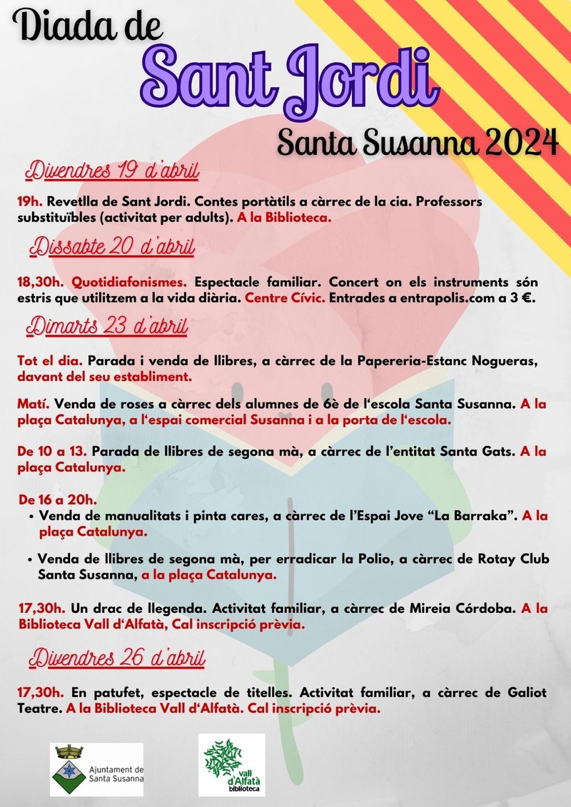 Per Sant Jordi, Santa Susanna celebra una sèrie d'activitats tradicionals per a tots els públics. Entre aquestes, s'hi inclouen contacontes, espectacles familiars, concerts i activitats per als més joves. La jornada de Sant Jordi també compta amb parades de llibres i roses en diversos punts de la vila, a més de mercats de llibres de segona mà amb finalitats benèfiques. Aquestes activitats es duen a terme en espais emblemàtics com la Biblioteca, el Centre Cívic i la plaça Catalunya, creant un ambient festiu i cultural per gaudir d'aquesta diada tan especial.